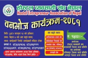 होस्टल ब्यवसायी संघ काठमाडौको आयोजना तथा ललितपुर र भक्तपुर जिल्ला कार्यसमितीको सहआयोजनामा २०८१ फागुन १० गते शनिबार हुन गैरहेको वनभोज कार्यक्रमको टिकट बिक्री वितरण विभिन्न क्षेत्रका क्षेत्रीय समितिका पदाधिकारीज्यूहरुलाई जिम्मा दिइएको कुरा जानकारी गराउँदछौ ।